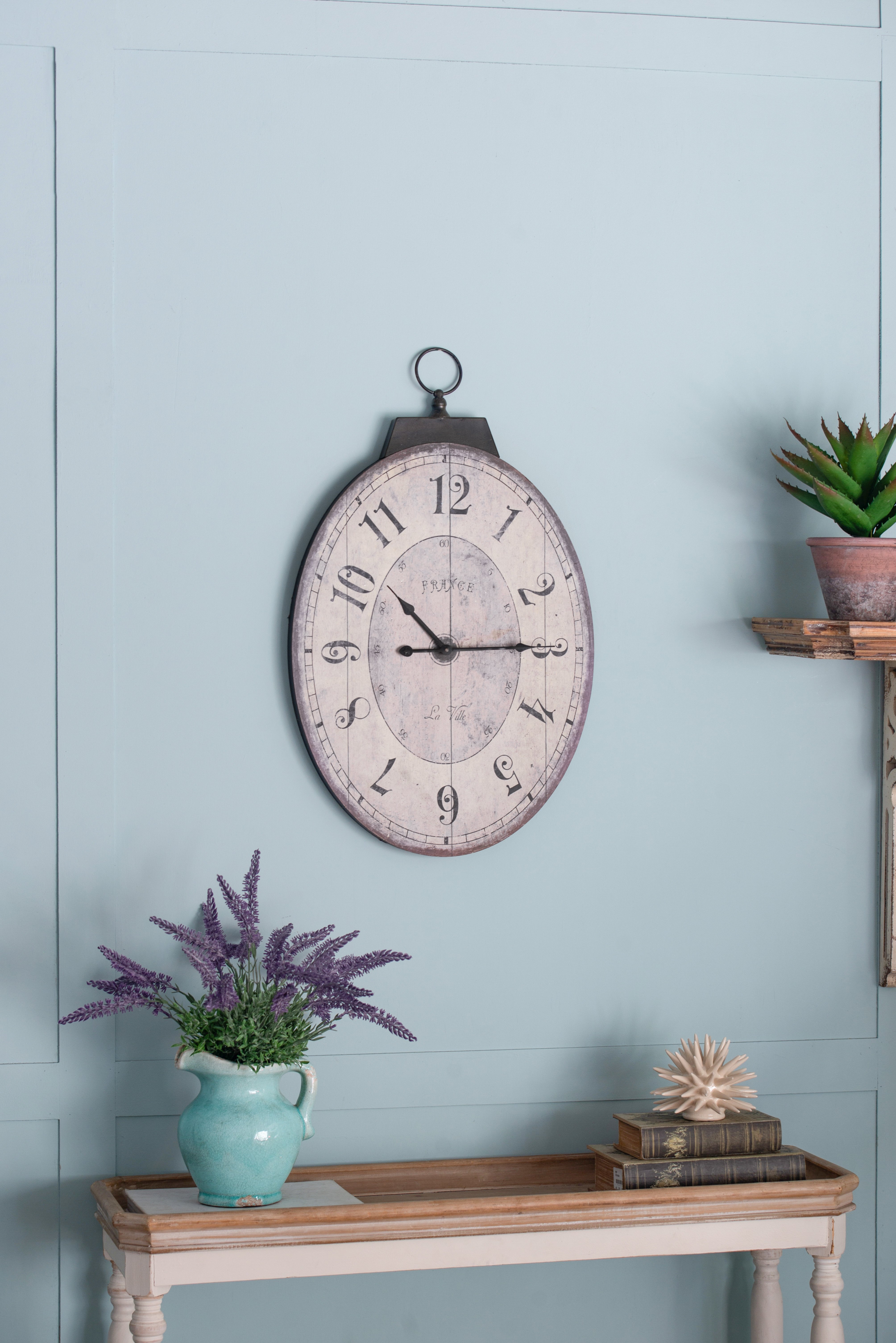 With its simple clock face, decorative numerals, and weathered look, the Thaddeus Oval Wall Clock from the Southern Living Collection adds an understated elegance to any space. Hang above an entryway table, on a kitchen wall, or above the living room mantle for a warm yet sophisticated look. The Thaddeus Wall Clock offers a casual, refined look that fits a variety of decors.