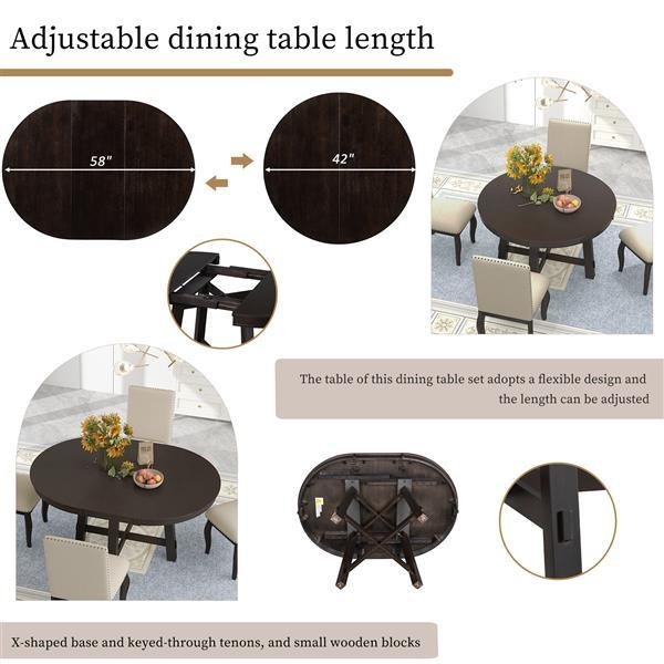 Full Size Platform Bed with Under-bed Drawers, WhiteThis bed comes with modern and simple appearance which can fit in any home decor. Eight legs are available to support the bed and two large drawers offer great storage function. The bed is 10.5'' off the floor, so there's spacious underneath space, you can use it for storage if you want. Constructed of solid pine wood and MDF, the platform bed can withstand the test of time and serve your family for many years. With elegant appearance and sturdy frame, this bed can provides superior experience.DescriptionMaterialPine wood+MDFSizeFullColourWhiteNumbers of slat10FunctionPlatform bedDecorationWith drawersNumbers of package1Spring boxNo needAssembly requiredYesDimensionsOverall Product Dimension76''L*57.6''W*36.2''HPackage DimensionPlease refer to the SpecificationBed52.8''x 76''Total height36.2''Overall Product Weight75lbBed weight capability300lbRecommended mattress thickness8-10''5-piece dining table set: With round tabletop and special curved chair legs, this 5-piece dining table set represents a elegant and temperament atmosphere. The graceful natural wood texture on the tabletop and upholstered dining chairs, that is suitable for farmhouse or modern style dining room. Moreover, the adjustable dining table length makes this dining set suitable for any size room.Stable & Solid Structure: This dining table set is expertly crafted of MDF and rubber wood. Tabletop is finished with oak wood veneers. The use of veneers results in high-quality furniture that has flawless surfaces and consistent color tones that will not be subject to cracking. Solid wood chair legs are hand-finished, creating a charming curved shape makes this dining table set more attractive and elegant.Adjustable dining table length: The dining table with an X-shaped base and keyed-through tenons, and small wooden blocks on the tabletop edge make this dining table more stable and durable. Taking into account the use of different scenarios, the table of this dining table set adopts a flexible design and the length can be adjusted. The round table's planked top is eased along the edges, then insert a leaf, it can extend to accommodate additional guests. Seats up to 6.Exquisite Craftsmanship: Our Dining Chair is deeply cushioned and richly upholstered in top-quality fabrics. Antique-bronze nailheads outline the seat and back. Comfortably seats up to 4 people. The thickness of cushion of chairs is 2.75 inches to guarantee wonderful using experiences. Four high back upholstered chairs have curved chair back top styling to provide better back support.Install Instructions & Weight Capacity: Full assembly required. Users will receive two parcels, one is for table, and another is for all of chairs. Install instruction manual will be shipped with the products, and users can install all of the parts of this dining set without any errors as long as they follow the logical and clear instructions. The load-bearing capacity of tabletop is 3 lbs, and the same parameter of each chair is 25 lbs.