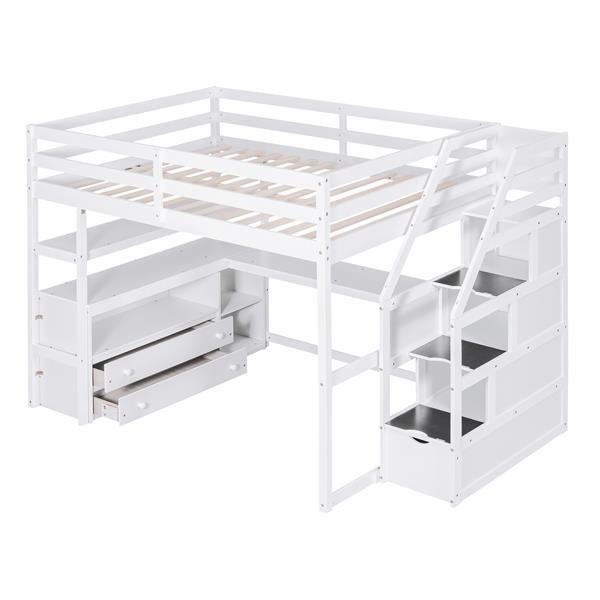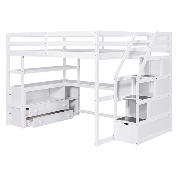 Full Size Loft Bed with Desk and Shelves, Two Built-in Drawers, Storage Staircase, WhiteThis full size loft bed with desk, shelves and drawers is a simple and stylish bed frame that coordinates well with a variety of decor styles, allowing you to elevate and enhance your space with ease. Staircase can ensure that you can reach the upper bunk safely, and can also provide storage space for your items. Made of solid solid pine wood with strong support slats, this bed is durable and sure to accompany you for many years to come. What's more, it's a desk, shelf and two large storage drawers all in one.DescriptionMaterialPine Wood+MDFSizeFullColorWhiteNumbers of Package3Spring boxNo needAssembly RequiredYesOriginVietnamDimensionsOverall Product Dimension95.1''L*57''W*65''HPackage DimensionPlease refer to the SpecificationBed Dimension76''x 55.5''Total height65''Overall Product Weight295.5lbLoft Bed Weight Capability350lbRecommend Mattress thickness6''[Multifunctionl Design]This loft bed includes a desk, shelves storage staircase and two large storage drawers in one.Not only provides you with a place to work or study, but also provides a large storage space.[Maximized Space] The full loft bed can save plenty of room for you to place other furniture in your bedroom. This bed provide ample storage for your everyday items.[Sturdy Frame] The bed structure is crafted from high-quality solid pine wood, solid pine legs and a strong, durable frame so that the bed is sturdy and durable.[Safety Guaranteed] Solid wood slats blend naturally into the already sturdy frame to give added ground-up support that provides stability.The loft bed features guard rails for added safety, and is accessible via the sturdy, slanted staircase. Enjoy many long years of relaxation and family fun, secure in this meticulously designed wood loft bed.[No Box Spring Needed] The wood slats support the mattresses not to slide and increase the service life.