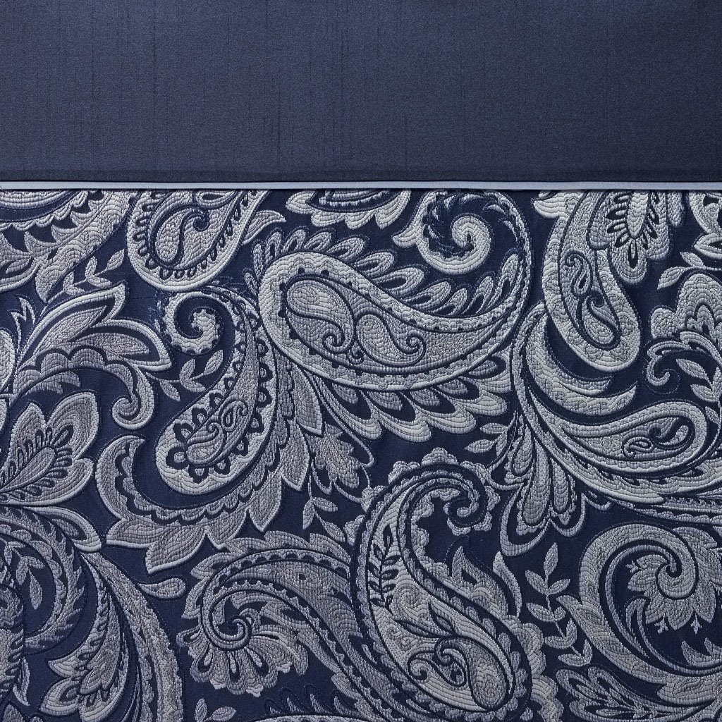 The Madison Park Aubrey Polyester Jacquard Shower Curtain creates a sophisticated modern look in your bathroom. The pieced design flaunts a beautiful woven jacquard in an updated paisley motif with a large solid stripe at the top of the shower curtain. This jacquard shower curtain is machine washable for easy care. Complete the collection and look with coordinate bath towels, bath rugs, bedding, window, and dec pillow - available and sold separately.
