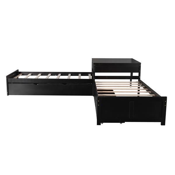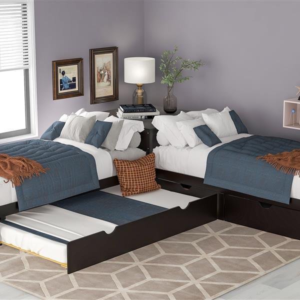 Full Size Daybed with Support LegsAre you finding a bed or sofa to sleep or have rest in leisure time? Our dual-use daybed frame can be used as sofa or bed. It is a good choice for you. High-quality, solid pine legs and a strong, durable frame ensures stability and durability for long-term use. Slat kit included so box springs are not required. This daybed is designed with a clean silhouette and a hue of elegance. It suits all styles of home decoration, and completes the look of any bedroom.Weight & DimensionsOverall Product Dimension78.2"L x 55.3"W x 35.4"HNumber of Package1Overall Product Weight61.24LBSWeight Capacity350LBSRecommended Mattress Thickness6"SpecificationsProduct TypeDaybedSizeFullColorWhite/EspressoMaterialPlywood+MDF+PinewoodNumber of Slats10Country of OriginVietnamNotesManual measurement has been used,there may be some reasonable error. All the pictures are taken by actual samples, slight chromatic aberration may occur due to lighting or display.[3 Beds in 1] This L shaped bunk bed features 3 beds,the twin corner platform bed is perfect for families who have several members, and more,you can also accomodate overnight friends of yours,perfect for limited space.[Built-in Table and Drawers Storage] Our L-shaped platform bed frame is equipped with a built-in table which can be used as an oversize nightstand with more space and more weight capability.And two drawers under the bed can store daily necessities such as toys or books. They can meet your different needs.[Sturdy Construction] Constructed of solid pine wood+MDF, this L-shaped platform bed features a sturdy high quality solid wood construction for durability and high load capacity, ensuring longevity.[Convertible Trundle and Drawers] The trundle and the two drawers are convertible, both of them can be put left or right.[Easy Assembly] Each order comes with a clear and detailed assembly instruction guide and all necessary tools are provided to get your bed assembled in no time.