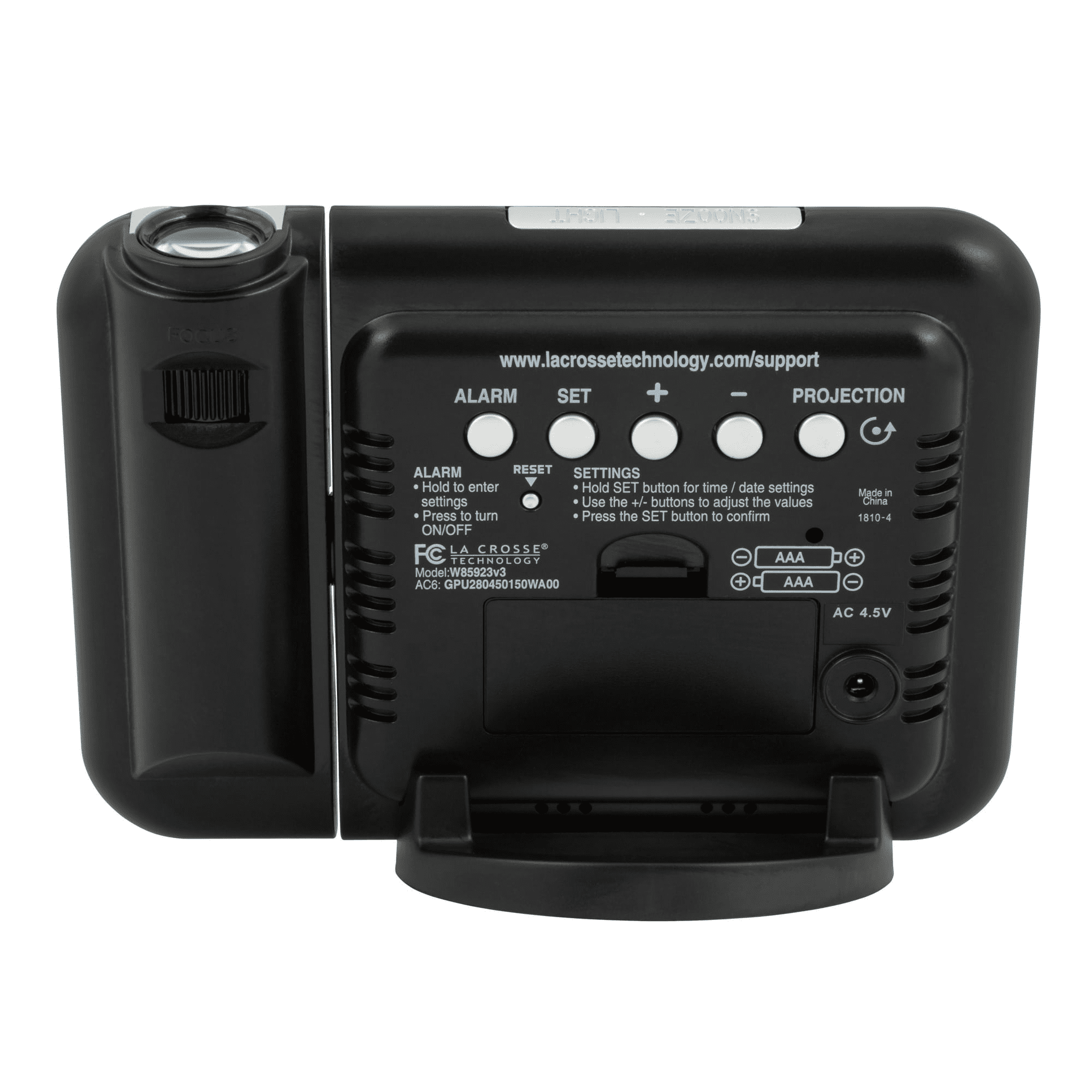 La crosse technology's projection color alarm is more than your average alarm clock. This bedside led alarm clock is loaded with winning features, including projection, 12/24-hour time view with calendar and temperature. It offers projection rotation, so you can view from any direction and adjustable focus for better viewing. It is just the right size for nearly any table or nightstand and features adjustable backlight intensity settings. Crescendo alarm sound and 10 minute snooze operates on ac adapter and has power backup (optional two aaa) as needed.