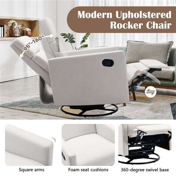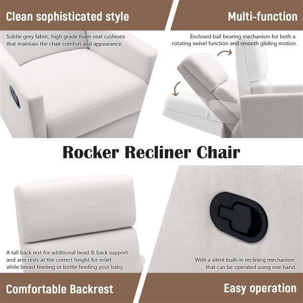 Twin over Full Bunk Bed with Drawers,Storage and Slide, Multifunction, WhiteMake full use of the structure of the bed itself to create a suitable home environment for you, this bed is a great choice! The seemingly simple appearance is actually fully functional. At least two family members can share this bunk bed. The two drawers under the bed and the storage rack on the ladder are enough to store the items. The design of the slide is safe and increases the fun of the children. The ladder structure is strong with handrails. Assembly needed. Share the fun of installation together and create a comfortable and fun sleeping environment for you. Get it!DescriptionMaterialPine wood+MDFSizeTwin/FullColorWhiteFunctionDrawer/slide/staircaseDecorationHollow vertical stripesnumbers of package3Spring boxNo needAssembly RequiredYesOriginVietnamDimensionsUpper bed42.4'' x 77.9''Down bed57.6'' x 77.9''Total height61.4''Upper Bed Weight capability400lbDown bed Weight capability400lbUpper bed Mattress thickness6''Down bed Mattress thickness8-10''MODERN DESIGN:With its tall back and stylish looks, it has the clean lines and square arms,the Rocking Recliner brings together the best of both worlds. When you're not reclining, it's a relaxing rocker with a smooth, graceful motion.COMFORTABLE & STURDY:This swivel recliner is composed of comfortable and soft fabrics with high-density soft foam padded seat and back, which perfectly wraps your body and brings you the ultimate comfort. Sturdy metal construction with a swivel base and solid wood frame ensures the recliner chair can hold more weight, and durable enough to function properly for years.MULTHIFUCTIONAL:This contemporary swivel push-back recliner is able to tilt from 95° to 16 °, providing you with the best angle of comfort, not only for working and reading, but also for napping and sleeping. The recliner supports 36 ° rotating gliding ability to provide you with fun in your life.SUITABLE FOR MORE STYLES:With multiple color choices, the Nursery Glider Swivel Rocker Chair is deigned to naturally move from the nursery to the living room, master bedroom, or any other room that needs a cozy spot to relax.EASY ASSEMBLY :It's easy to assemble this chair when you open the box, just need 1 minutes to assemble. If you have any questions, please contact us freely, we are glad to help you solve it.
