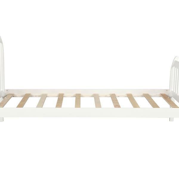 Wooden Twin Size House Bed with 2 Drawers,Kids Bed with Storage Shelf, WhiteFeaturing roof, this bed doubles as a semi-enclosed play place perfect for kids to study, watch TV or explore their imaginations.There is a shelf on the back of this bed, which can be used to store decoration, clocks, books and small things. This bed looks like a tiny house thanks to the pitched roof. This design is very childlike and can cater to childlike preferences.The contemporary style and neutral finish blend smoothly with any color scheme, allowing this design to shine! With roof and a sturdy pine frame, this bed offers a safe space for your kids to get a good night's sleep.Features:Product TypeHouse BedColorWhite/GrayProduct materialPlywood+Pinewood+MDFSizeTwinDetail Product DimensionPlease refer to the Size imageWeight Capacity250lbsRecommended Mattress Thickness6"Assembly RequiredYesCountry of OriginVietnamModern design and clean styling add a decorative touch. Compact design allows for tight spaces.Bed frame with wooden slat suppor provide strong support and stability for years of lasting use. And avoid sliding or wobbling.Bed frame platform with wooden slats increase the suppleness of the mattress. No box spring needed.Bed frame with space underneath for storage. Provide plenty of other things you need to store. Storage space: 8 " L x 41.3" W x 1 " HOverall dimensions: 8 " L X 41.3" W X 4 .4" H; Bed frame comes with simple and clear instrctions and complete accessories. Easy assembly.No Mattress Included