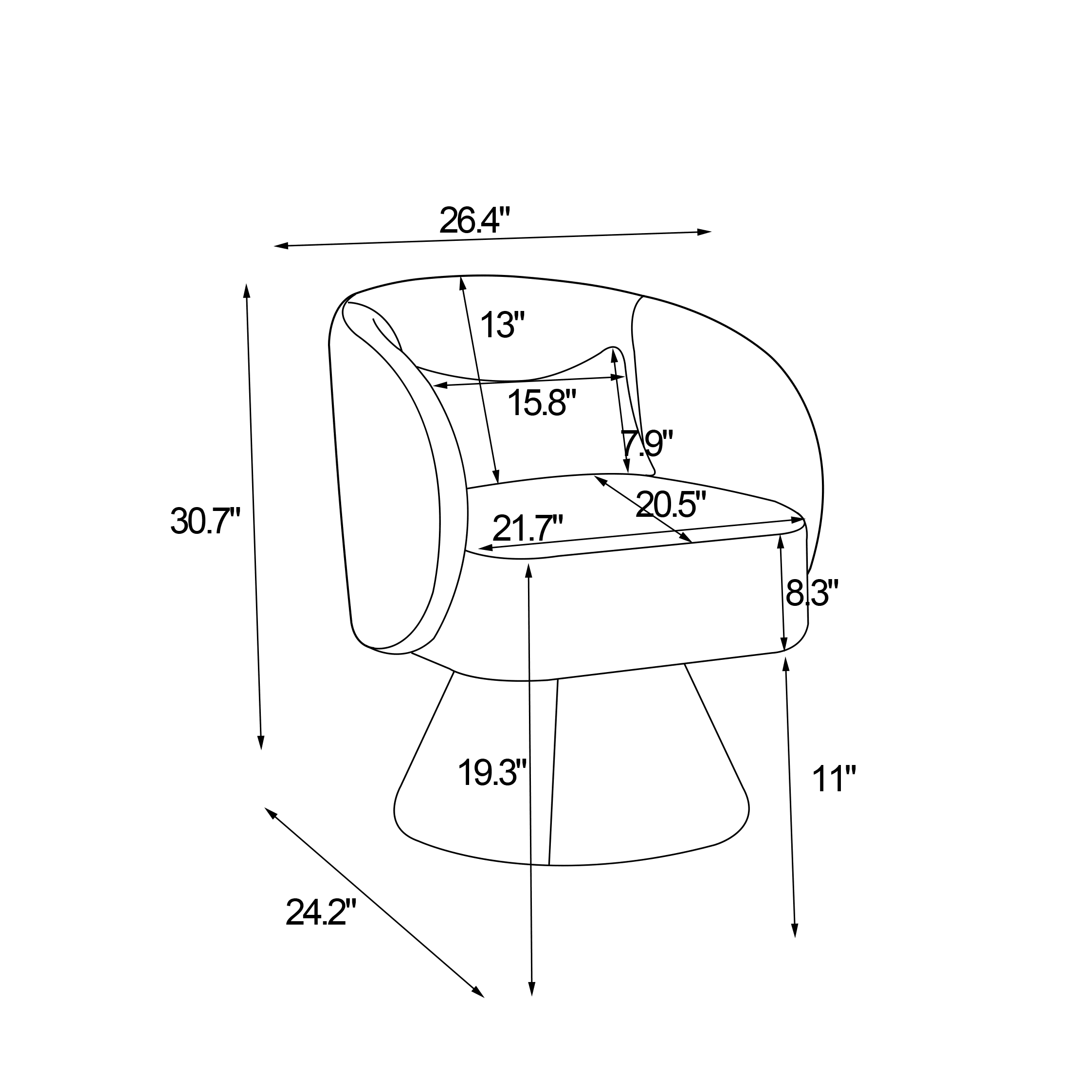 OverallW26.4 "×D24.2"×H30.7"Seat Width21.7"Seat depth20.5"Seat Height19.3"Arm Height24.8"Back Height - Seat to Top of Back13"Net weight / Gross Weight28.6LB/33LBWeight Capacity300LBLeg materialManufactured Wood; Solid WoodUpholstery MaterialLinenFrame MaterialManufactured Wood; Solid WoodSeat ConstructionSinuous SpringsSeat Fill MaterialSpongesBack TypeFixed BackBack Fill MaterialSpongesCleaning CodeSpot clean with dry, solvent-based cleanerAssembly RequiredYesSwivel360