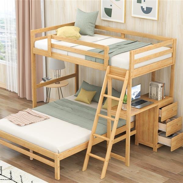 Twin size Loft Bed Wood Bed with Two Storage BoxesA novel idea be put into design when manufacturing this marvelous loft bed, a ladder be exchanged to a climbing frame which appealed to most people much more. And the way to get out of bed is sliding. This interesting design loft bed offer the chance to train your physical coordination in daily life and push them gain more happiness in bedroom. The double-sided chalkboard set on three sides allow you use your imagination and creativity at any time, and stimulate the potential of your brain. Additional storage boxes is another shining idea in design as they are great useful and helpful tools for parents. The open design storage boxes are the perfect space to store all sorts of toys and daily necessities. Four classic colors make you can choose your favorite color freely.Weight & DimensionsOverall Product Dimension78.5"L x 79.2"W x 34"HDetail Product DimensionPlease refer to the Size imageNumber of Package1Package DimensionPlease refer to the SpecificationOverall Product Weight107 LBSPackage WeightPlease refer to the SpecificationWeight Capacity175LBSRecommended Mattress Thickness6"SpecificationsProduct TypeLoft BedSizeTwinColorEspresso/Natrual/Gray/WhiteProduct materialPlywood+MDF+Pine woodBed slat materialPlywoodLevel of AssemblyPartial assemblySplit into two bedsNoBox Spring RequiredNoMattress IncludedNoEstimated Time to Assemble30 minutesSuggested Number of People2Additional Tools RequiredScrewdriverAvoid power toolsYesCountry of OriginVietnamNotesManual measurement has been used,there may be some reasonable error.All the pictures are taken by actual samples, slight chromatic aberration may occur due to lighting or display.[Twin over Full] Coming with twin over full bunk bed features one twin size loft bed with storage and one full size platform bed for accommodating your kids or any overnight sleepers.[Separate Design] It can also be divided into two independent beds for even more convenience.[Large Storage Space] This versatile bed can meet your various needs. Down bed can be placed directly under the bed or on the other side. loft bed with desk and drawers, makes it easy for you to put a lamp on or store books and other items.[Solid Construction] Crafted from solid pine wood and MDF, it features two beds with slats to support your preferred mattresses without the help of box springs. Ensures stability and durability for long-term use.[Easy to Assemble] All parts included in your package are indicated clearly. With step-by-step installation manual and per-drilled holes, you can easily assemble this side table individually.Manual installation is recommended.