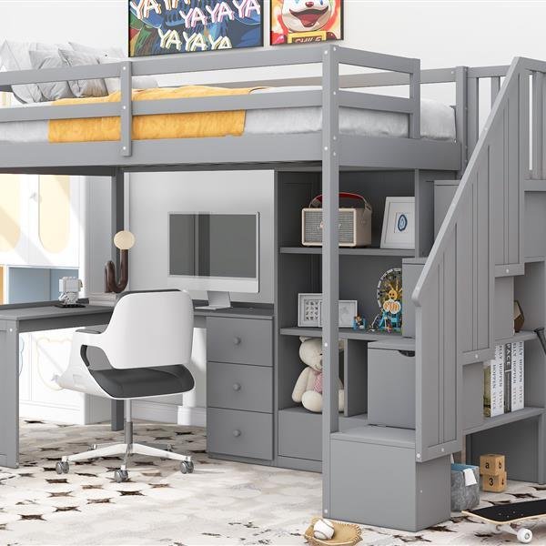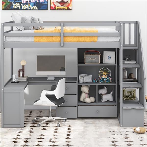 Twin Size Loft Bed with L-Shaped Desk and Drawers, Cabinet and Storage Staircase, Gray